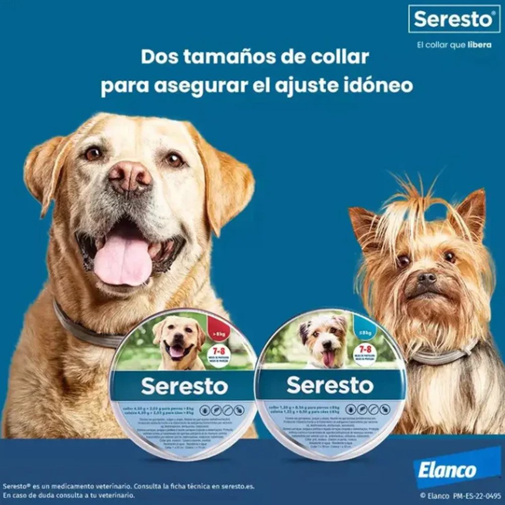 Seresto collar antiparasitos está disponible en dos tamaños: 70cm para perros +8kg y 38cm para perros -8kg